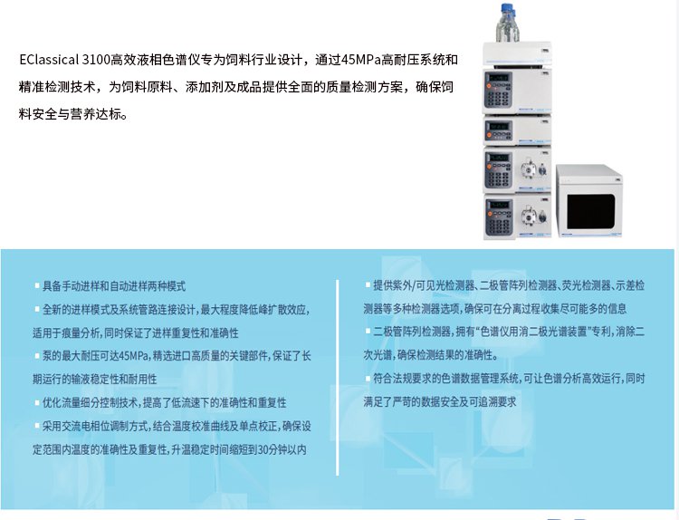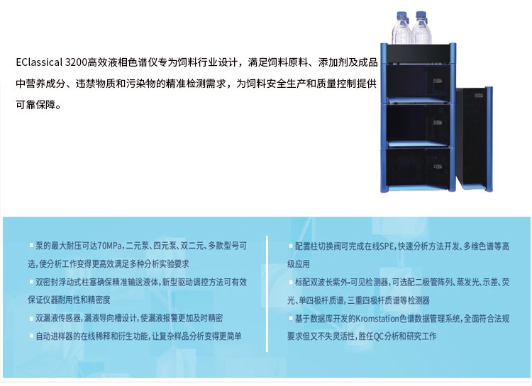 依利特科技系列HPLC產(chǎn)品,包括EClassical 3200L UHPLC,Elassical 3200/3100 HPLC,Agress 1100 HPLC,以及SinoPak BEH、Supersil、SinoChrom等系列色譜柱,在飼料營(yíng)養(yǎng)成分(維生素、氨基酸)、飼料添加劑檢測(cè)(藥物添加劑、非營(yíng)養(yǎng)性添加劑)、飼料污染物檢測(cè)(霉菌毒素、重金屬)等方面有著廣泛的應(yīng)用。