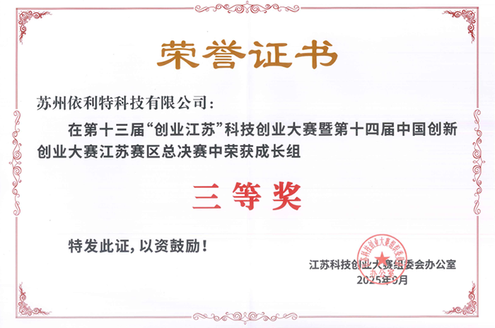 2025年9月23日至24日,第十三屆“創(chuàng)業(yè)江蘇”科技創(chuàng)業(yè)大賽總決賽暨第十四屆中國創(chuàng)新創(chuàng)業(yè)大賽江蘇賽區(qū)總決賽在南京江北新區(qū)圓滿落幕。蘇州依利特科技有限公司榮獲第十三屆“創(chuàng)業(yè)江蘇”科技創(chuàng)業(yè)大賽總決賽暨第十四屆中國創(chuàng)新創(chuàng)業(yè)大賽江蘇賽區(qū)總決賽成長組三等獎(jiǎng)。