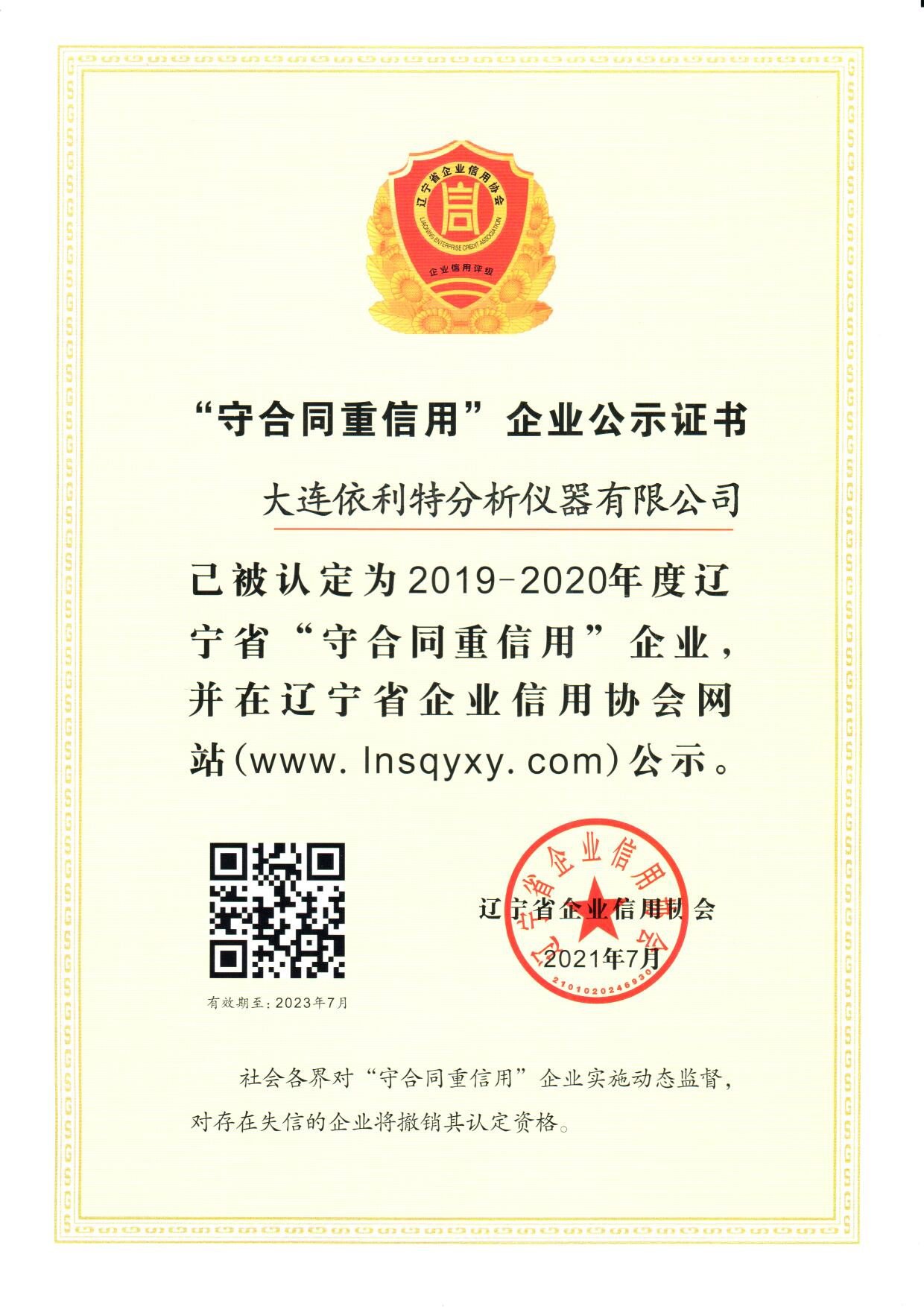 依利特公司榮獲遼寧省企業(yè)信用協(xié)會頒發(fā)的2019-2020年度遼寧省“守合同重信用”企業(yè)公示證書。