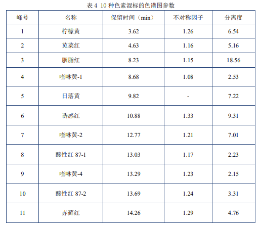 方法驗(yàn)證數(shù)據(jù):10 種色素的線性范圍(R2≥0.999)、精密度(RSD<2%)、加標(biāo)回收率(85%-110%)完整記錄;