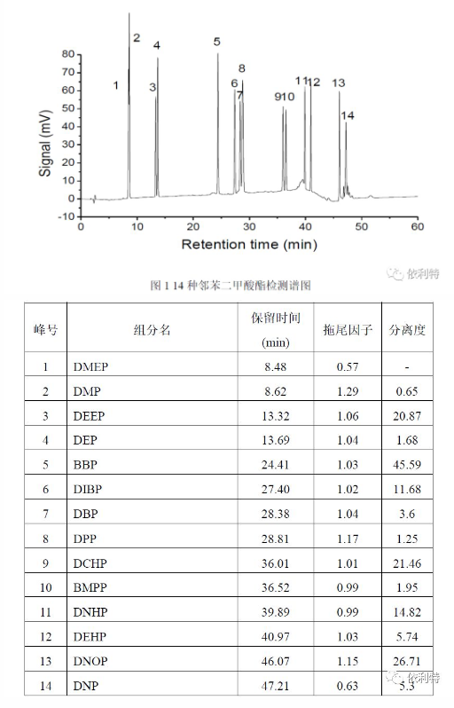 結果表明使用我公司高效液相色譜儀對14種鄰苯二甲酸酯類物質進行檢測,具有實驗簡單,成本低,結果可靠等優(yōu)點;可滿足食品、環(huán)境、電子產品等行業(yè)中對鄰苯二甲酸酯類物質的檢測要求。