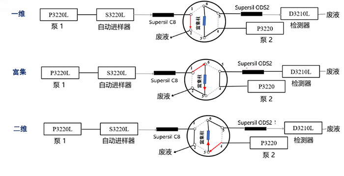 ① 除雜質(zhì):樣品進(jìn)入一維柱,非目標(biāo)組分排至廢液