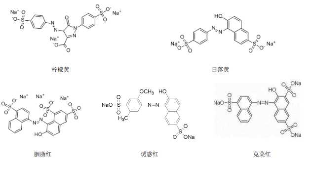 人工合成著色劑主要以苯、甲苯等化工產(chǎn)品為原料,經(jīng)過磺化、硝化、鹵化、偶氮化等一系列有機(jī)反應(yīng)而制得的人工色素。合成著色劑能有效改善食品色澤,被廣泛應(yīng)用于食品加工中,中國食品添加劑使用衛(wèi)生標(biāo)準(zhǔn)列入的合成色素主要有胭脂紅、莧菜紅、日落黃、赤蘚紅、檸檬黃、新紅、靛藍(lán)、亮藍(lán)等等。