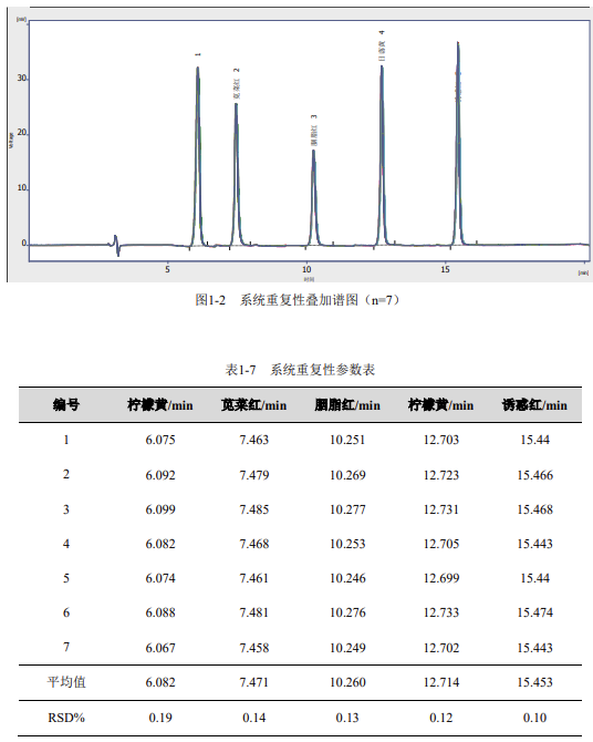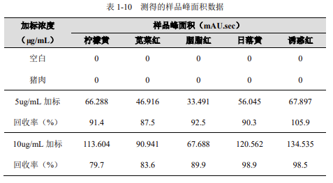 本系統(tǒng)的基線噪聲為 25μV,根據(jù) 3 倍信噪比,儀器的小檢出限分別為檸檬黃 20ng/mL,莧菜紅 22ng/mL,胭脂紅 33ng/mL,日落黃 20ng/mL,誘惑紅 17ng/mL。根據(jù)前處理方法計(jì)算,各目標(biāo)物的方法檢出限分別為檸檬黃 12.5μg/kg,莧菜紅 13.8μg/kg,胭脂紅 20.6μg/kg,日落黃 12.5μg/kg,誘惑紅 10.6μg/kg。