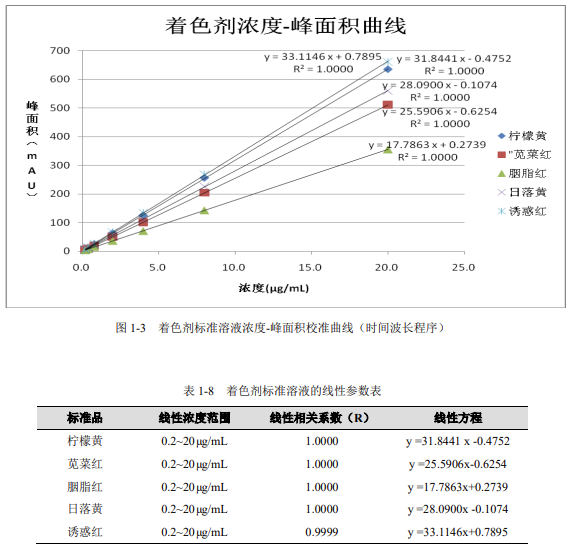 配制濃度分別為 0.2μg/mL、0.4μg/mL、0.8μg/mL、2.0μg/mL、4.0μg/mL、8.0μg/mL、20.0μg/mL 的著色劑混標(biāo)工作液,按濃度由低至高進(jìn)樣,以標(biāo)準(zhǔn)品濃度為橫坐標(biāo),峰面積為縱坐標(biāo),繪制校準(zhǔn)曲線,著色劑的標(biāo)準(zhǔn)溶液線性相關(guān)性結(jié)果如下。