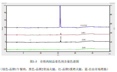 按照上述方法對(duì)市場上的幾種肉制品中著色劑的含量情況分析結(jié)果如下: