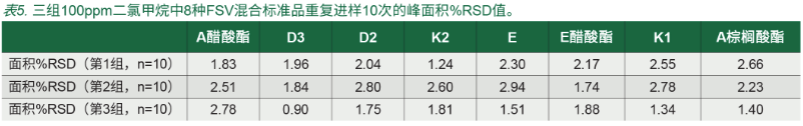 如圖 1 所示,在不到 15 分鐘的時間內(nèi)實現(xiàn)了 8 種維生素良好色譜分離,如圖 2 所示,5 次重復檢測的重疊顯示了出色的色譜重現(xiàn)性。三組 10 次重復進樣使用二氯甲烷制備的 100μg/mL FSV 標準品,所有峰面積的 % RSD 均小于 3%(表 5)。這表明進樣之間擁有出色的重現(xiàn)性。