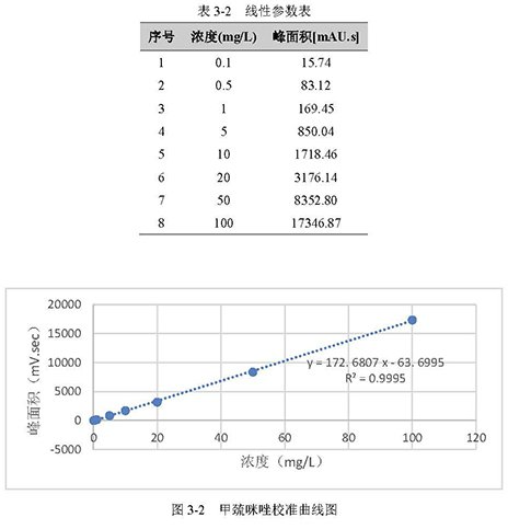 參照 GB/T 40894-2021 標(biāo)準(zhǔn)中方法,配制甲巰咪唑的標(biāo)準(zhǔn)溶液,質(zhì)量濃度為 0.1 mg/L、0.5 mg/L、1 mg/L、5 mg/L、10 mg/L、20 mg/L、50 mg/L 和 100 mg/L 的八個(gè)標(biāo)點(diǎn),計(jì)算相關(guān)線性系數(shù)。