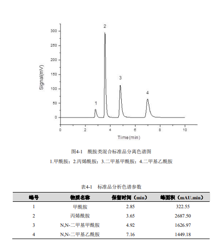 準確稱取 0.100g (精確至 ±0.0001g) 甲酰胺、0.100g (精確至 ±0.0001g) N,N - 二甲基甲酰胺、0.100g (精確至 ±0.0001g) N,N - 二甲基乙酰胺和 0.100g (精確至 ±0.0001g) 丙烯酰胺,用水溶解后全量轉(zhuǎn)入 100mL 容量瓶中,用水稀釋定容至標線,搖勻。配制成甲酰胺、N,N - 二甲基甲酰胺、N,N - 二甲基乙酰胺和丙烯酰胺濃度分別為 1000mg/L、500mg/L、1000mg/L 和 500mg/L 的酰胺類化合物混合標準貯備液,于 4℃以下冷藏、避光和密封可保存三個月,使用時應恢復至室溫并搖勻。