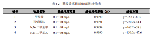 分別移取 0.10mL、2.50mL、5.00mL、8.00mL、10.00mL 酰胺類化合物標準使用液置于一組 50mL 容量瓶中,用水定容至標線,搖勻。由低濃度到高濃度依次移取 5.0μL 注入液相色譜儀,按照液相色譜參考條件進行分析測定。以標準系列溶液中目標化合物的濃度 (mg/L) 為橫坐標,以峰高或峰面積為縱坐標,建立酰胺類化合物標準曲線。