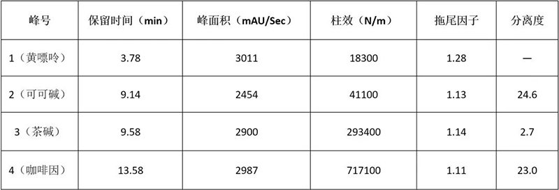 依利特新款的EClassical 3200液相色譜儀,搭配新款SinoPak BEH AQ-C18色譜柱,能很好的對咖啡因、可可堿、茶堿、黃嘌呤進(jìn)行分析,且峰形良好,滿足定性定量分析的要求。