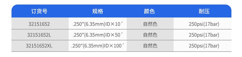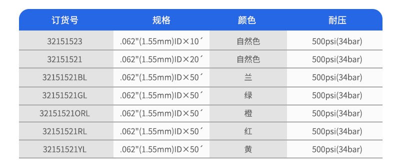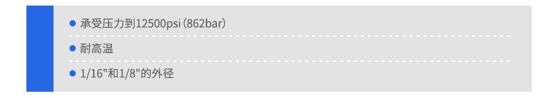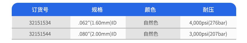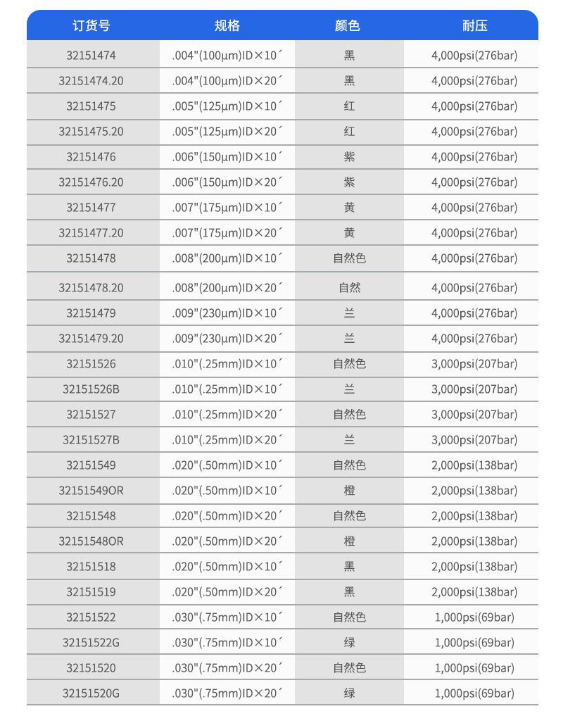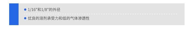 該種管有1/16"和1/8"外徑兩種規(guī)格,外徑和內(nèi)徑的公差分別為±0.001"和±0.003"。這種聚合物材料在100℃操作溫度下不會(huì)降低其機(jī)械強(qiáng)度。