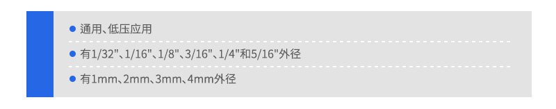 外徑1/16"PFA HP管和PFA HP Plus管的公差為±0.001",外徑1/8"的PFA HP管和PFA HP Plus管公差為土0.003"。外徑1/4"PFAHP管的公差為±0.004"。